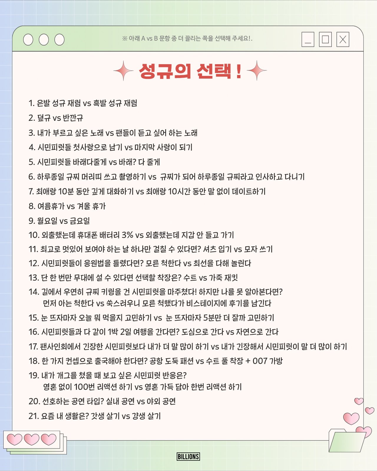 ① 성규의 선택 : 서베이 제출자 중 성규의 생각을 가장 많이 맞힌 분 중 3명 랜덤 추첨